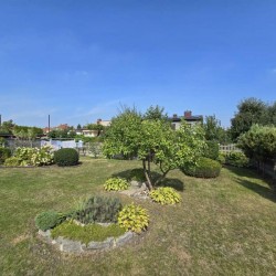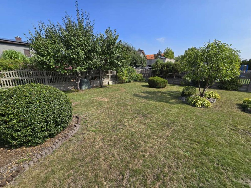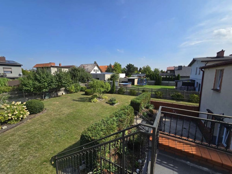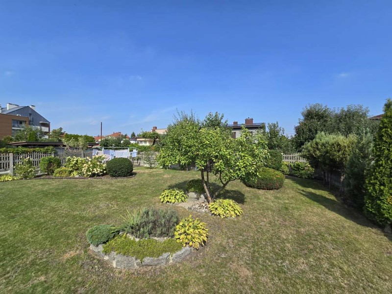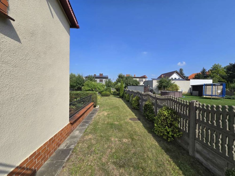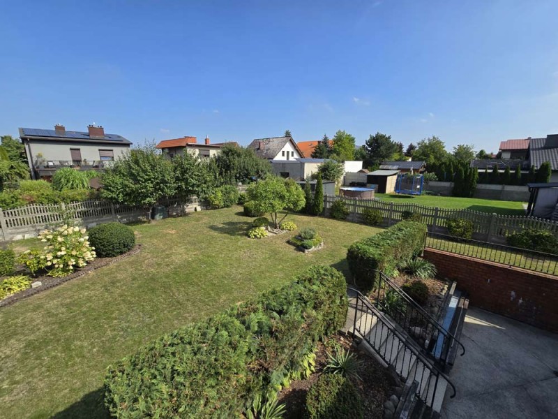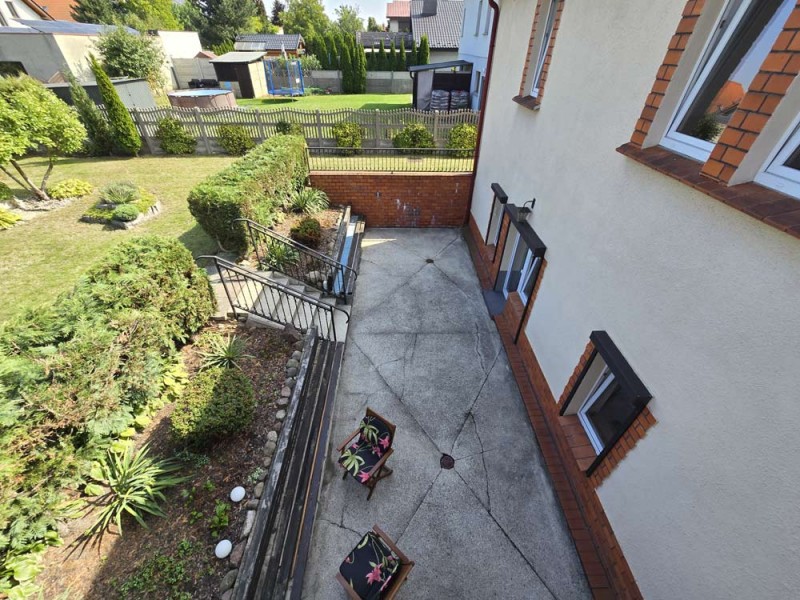 Działka jest ogrodzona i zagospodarowana, jej front został ogrodzony płotem metalowym na podmurówce a w pozostałej części płotem z płyt betonowych. Urządzony jest ogród z licznymi nasadzeniami krzewów ozdobnych i drzew owocowych. Balustrady na tarasach są kute. Garaż jest ogrzewany, został ocieplony z zewnątrz, jest zamykany bramą elektryczną segmentową Firmy Hormann. Pomieszczenie gospodarcze jest ogrzewane znajduje się w nim siła o mocy 400 V, podlicznik do wody ogrodowej, kuchenka gazowa oraz rozprowadzona instalacja wodno-kanalizacyjna. Wjazd i chodnik zostały utwardzone betonową kostką. Nieruchomość została przyłączona do sieci energetycznej, wodnej, kanalizacyjnej, gazowej oraz telewizji kablowej i internetu.
