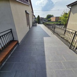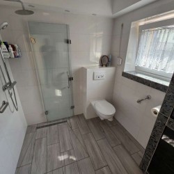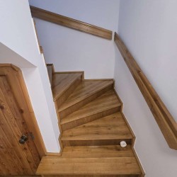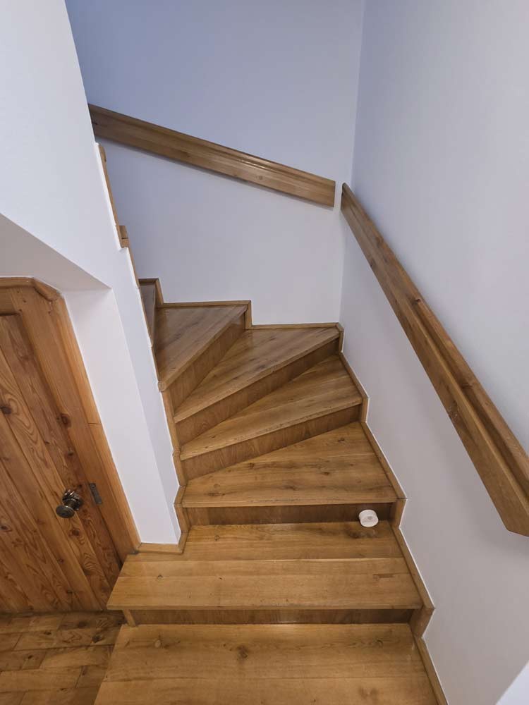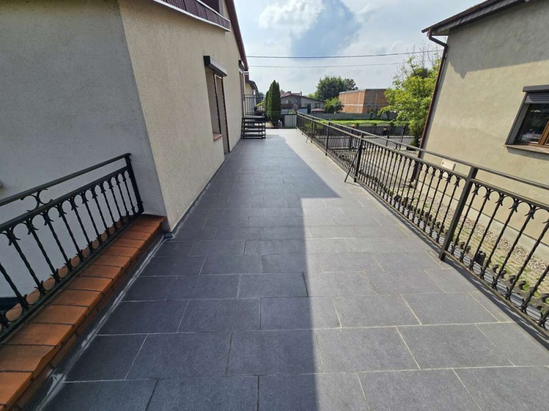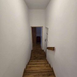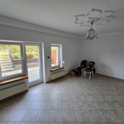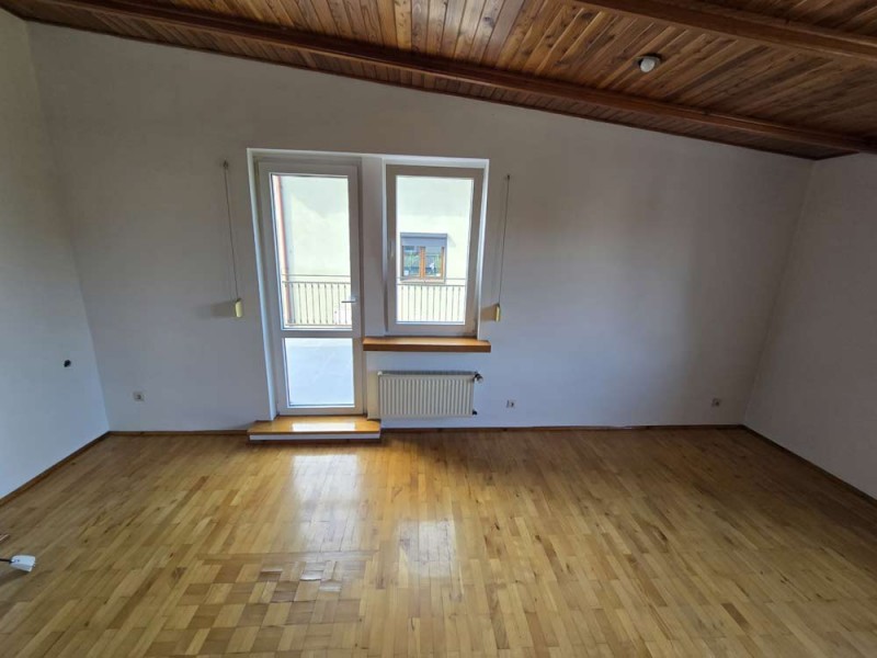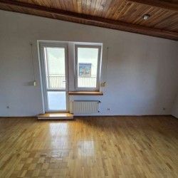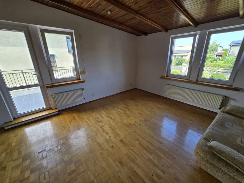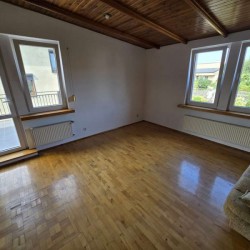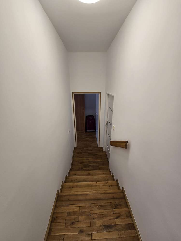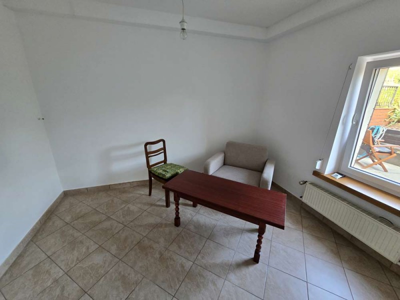 Drugi lokal na parterze składa się z pokoju z wyjściem na taras, sypialni oraz łazienki z wanną a na piętrze mamy do dyspozycji salon z wyjściem na taras, aneks kuchenny, kuchnię, spiżarnię i wiatrołap. Obie kondygnacje łączą przestrzenne klatki schodowe, których stopnie są drewniane.