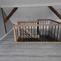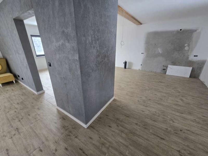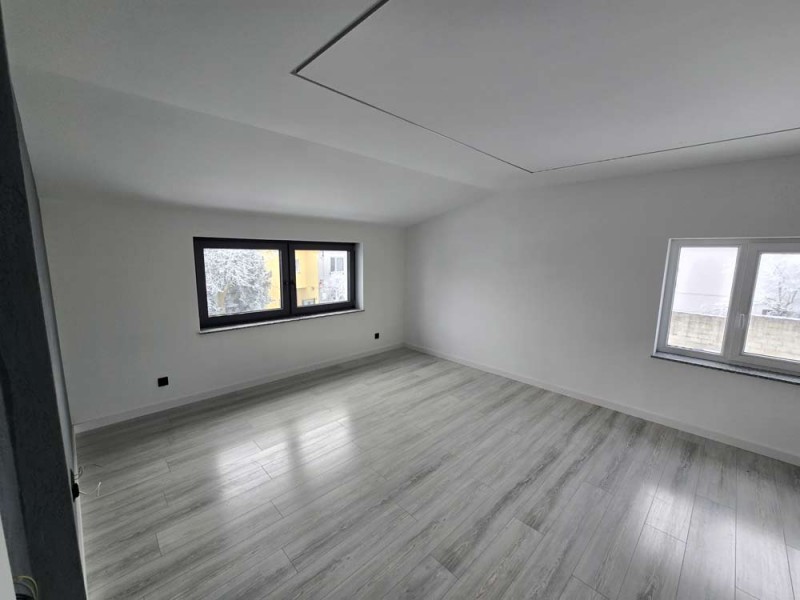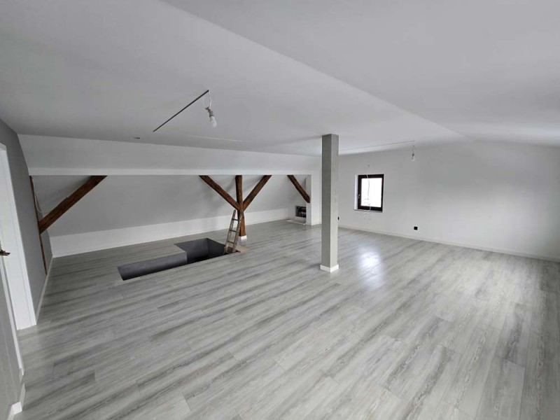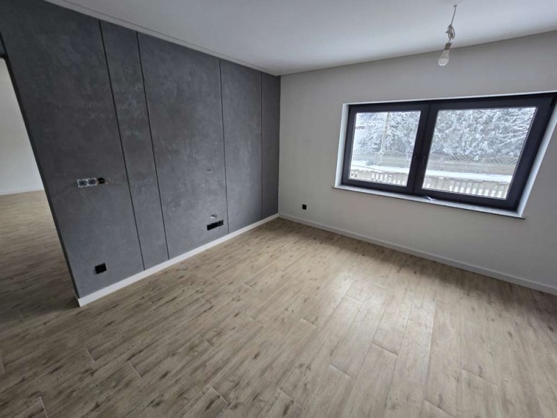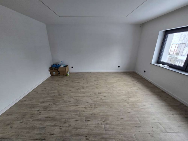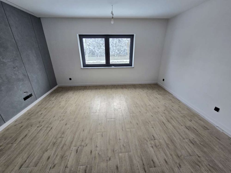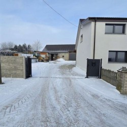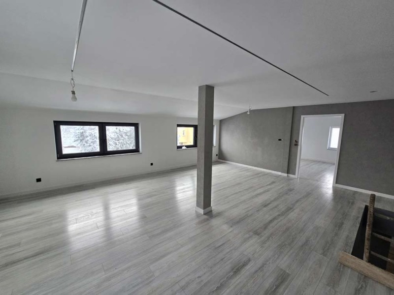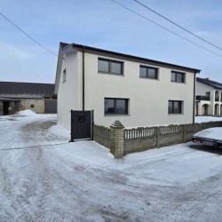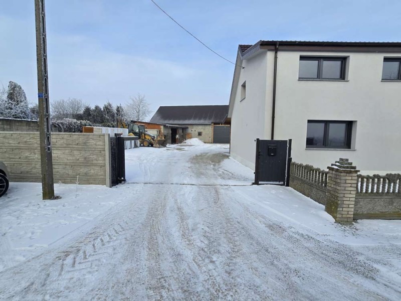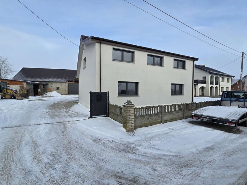 Na parterze znajduje się salon, kuchnia, pokój i łazienka a piętro obejmuje trzy pokoje i drugą łazienkę (pomieszczenia te są do adaptacji). Centralne ogrzewanie zasila piec na pellet z zasobnikiem wody. Drugi z budynków to budynek o powierzchni 90 m2 składający się z kuchni, łazienki, pomieszczenia gospodarczego i kotłowni. Materiałem budowy jest płyta obornicka i płyta osb. Pomieszczenia te są klimatyzowane. Zainstalowana jest instalacja fotowoltaiczna o mocy 10 kW oraz pompa ciepła z magazynem energii.