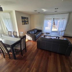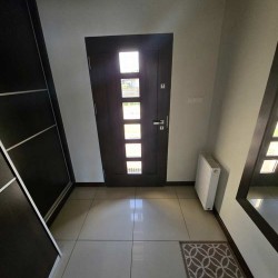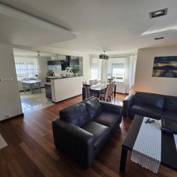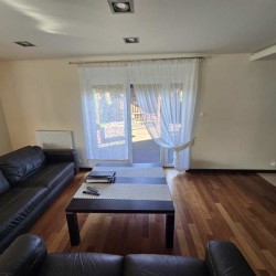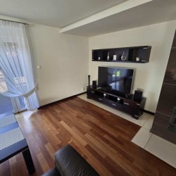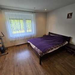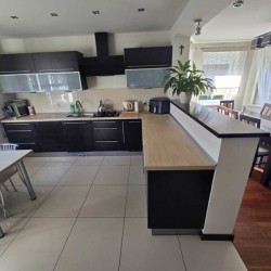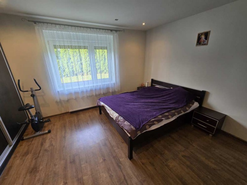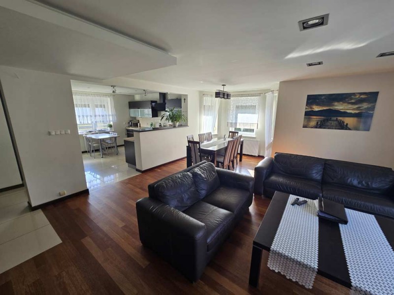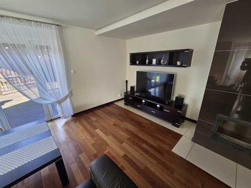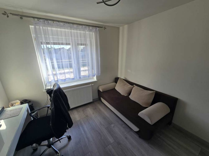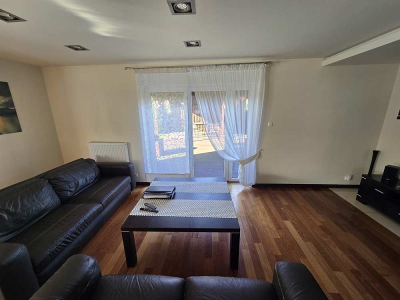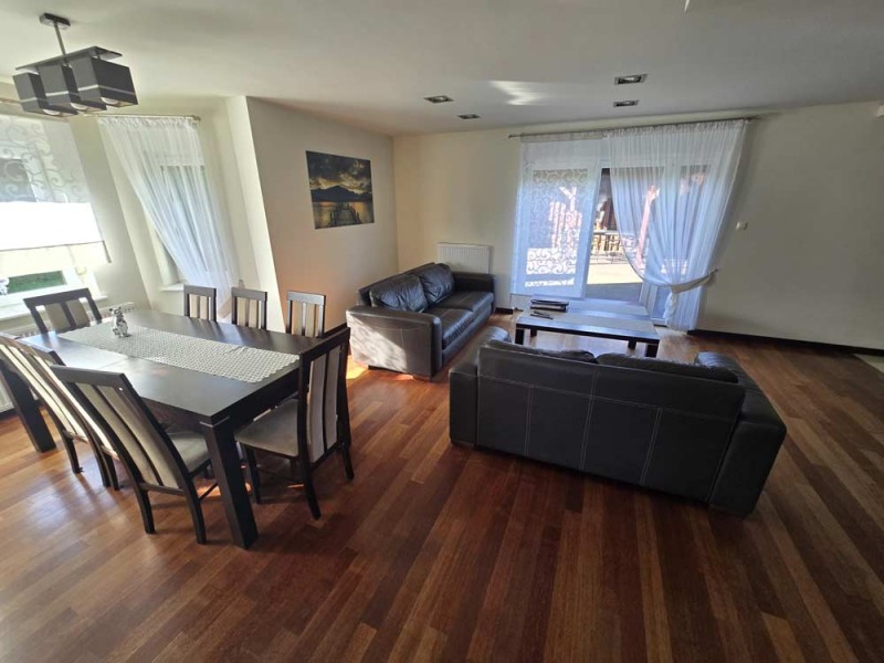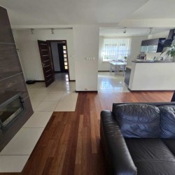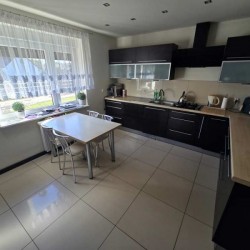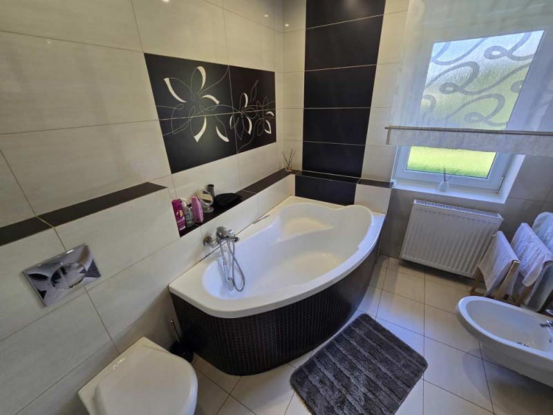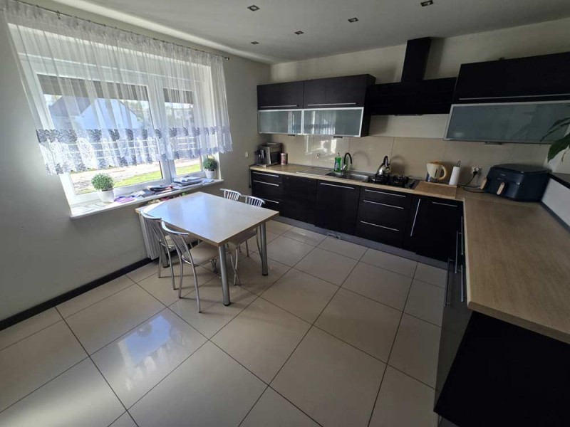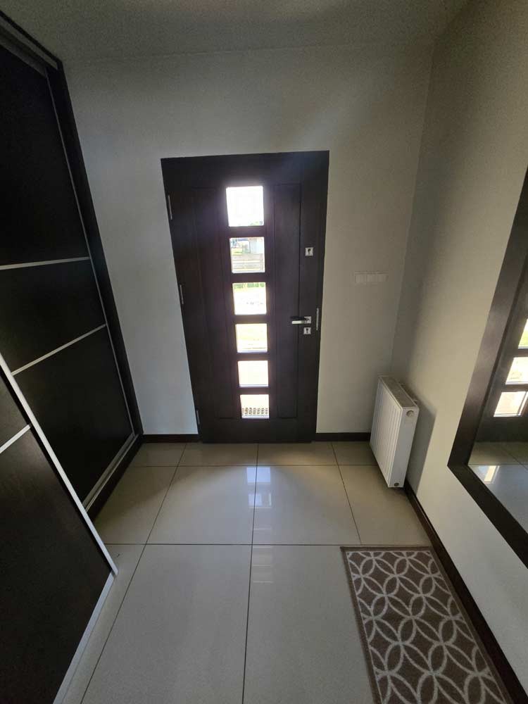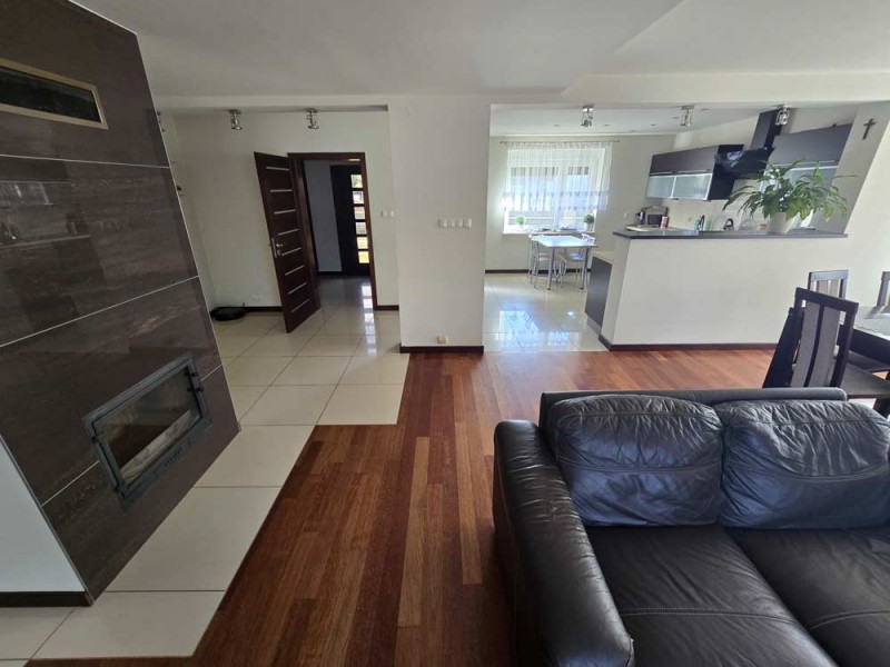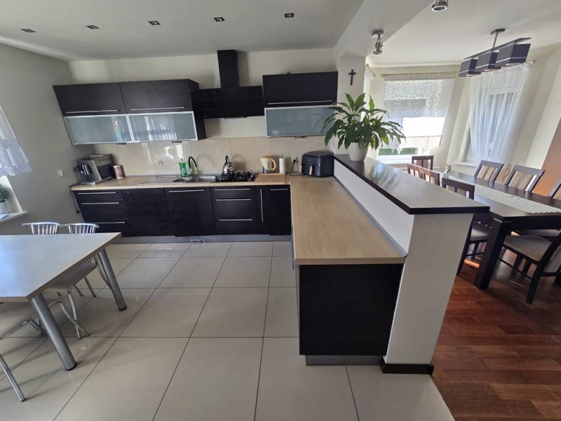 Zamontowane są okna z profili PCV z roletami zewnętrznymi aluminiowymi a na podłogach znajdują się panele i wielkoformatowe kafle ceramiczne. Ściany są gipsowane Kuchnia została umeblowana meblami na wymiar, wyposażono ją w sprzęt gospodarstwa domowego. Podłoga i ściany łazienki zostały wyłożone w płytkach ceramicznych, posiada ona wannę narożną, geberit, bidet oraz umywalkę. Centralne ogrzewanie i wodę ciepłą zasila piec na drewno z buforem co pozwala na stabilniejszą pracę instalacji centralnego ogrzewania i zwiększenie komfortu cieplnego w budynku. Grzejniki są stalowe. Cena obejmuje zabudowę trwałą - meble kuchenne wraz ze sprzętem agd oraz pojemne szafy garderobiane na wymiar. Pozostałe umeblowanie jest w opcji.