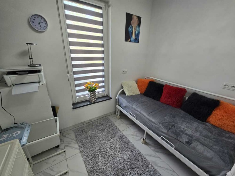 Wewnątrz mamy do dyspozycji pokój dzienny z aneksem kuchennym i wyjściem na taras, łazienkę, hol, dwie sypialnie, skrytkę pod schodami i przedsionek. Ogródek jest usytuowany od strony południowej i jest zadaszony i zagospodarowany