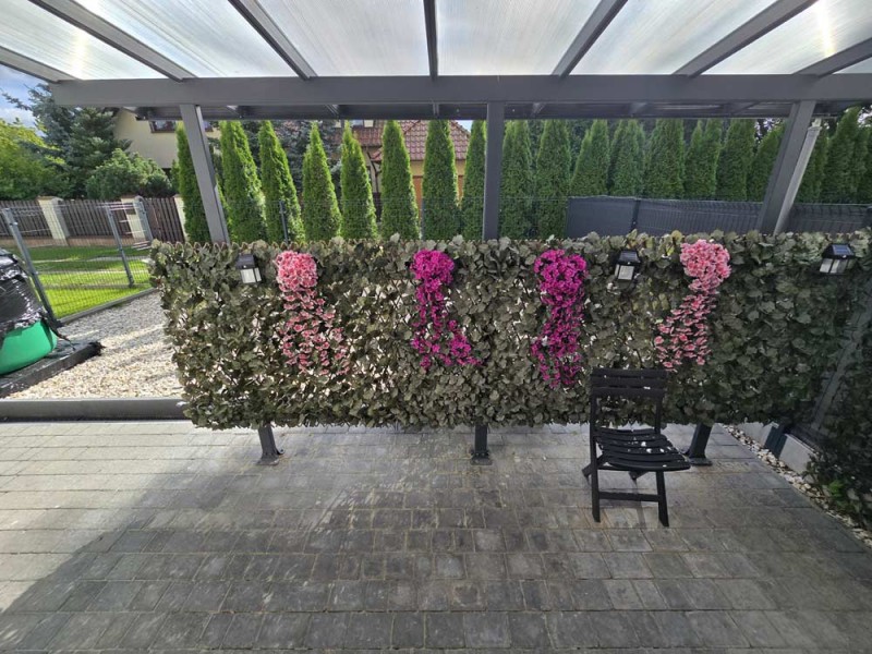 Teren wokół budynku został zagospodarowany, podjazd i chodnik utwardzony został ozdobną kostką. Na terenie ogródka znajduje się domek narzędziowy oraz zbiornik na deszczówkę.