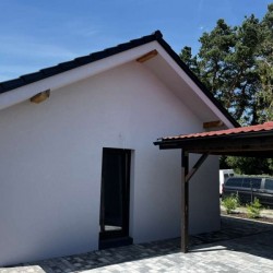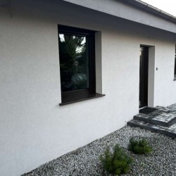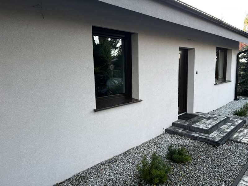 Dom wzniesiono z wysokiej jakości materiałów – ściany z pustaka ceramicznego Heluz, ocieplone 25-centymetrowym styropianem, a dach dwuspadowy pokryto dachówką ceramiczną. Stolarka okienna została zamontowana w technologii ciepłego montażu, a rynny wykonano z metalu.