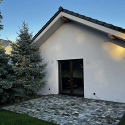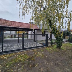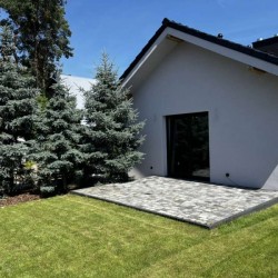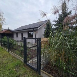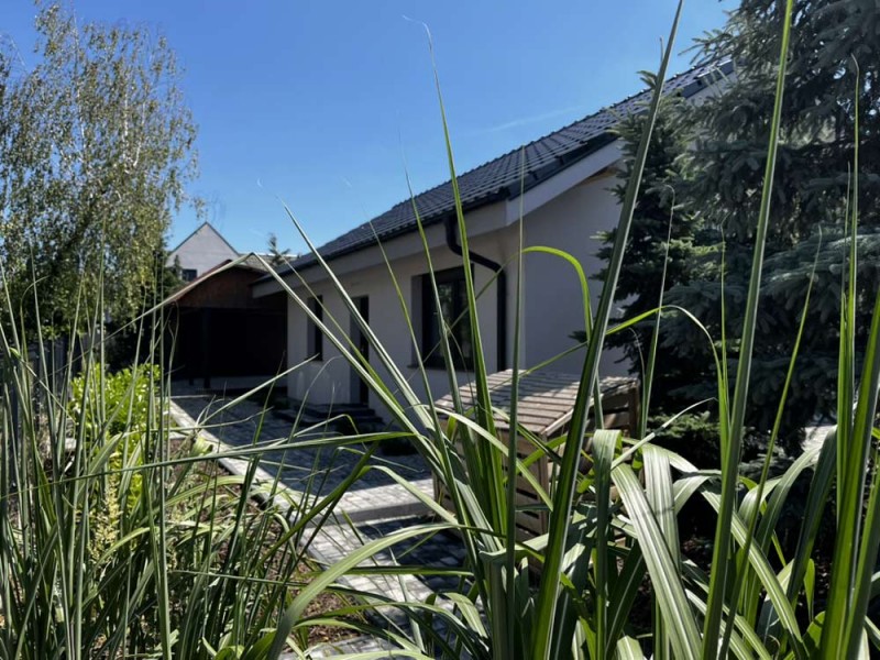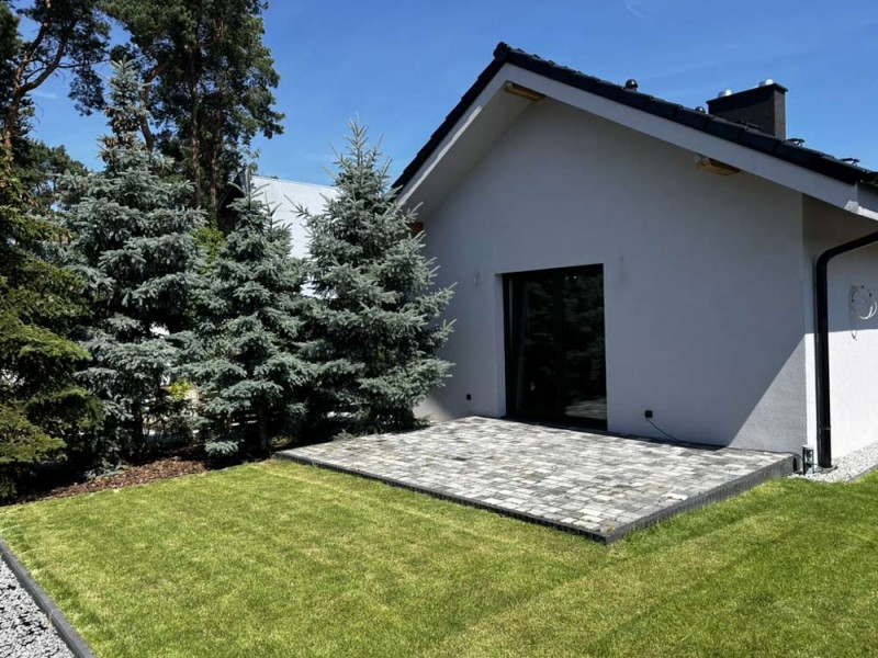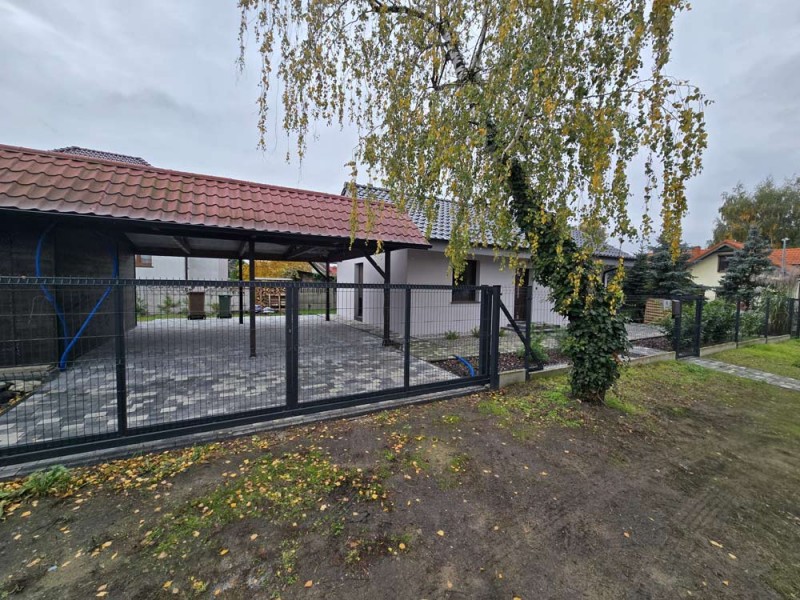 Działka jest ogrodzona i w pełni zagospodarowana. Wykonano podjazd, chodnik i taras z kostki brukowej. Ogród z nasadzeniami krzewów ozdobnych. Trawnik posiada system podlewania. Na posesji znajduje się wiata na dwa samochody, budynek gospodarczy oraz zadaszona wiata na drewno kominkowe.