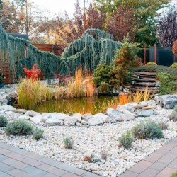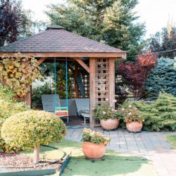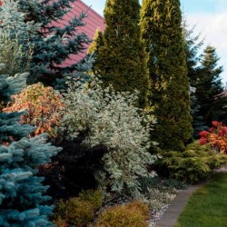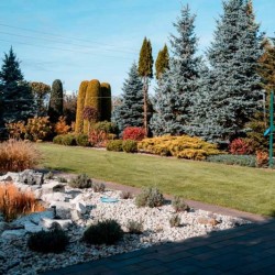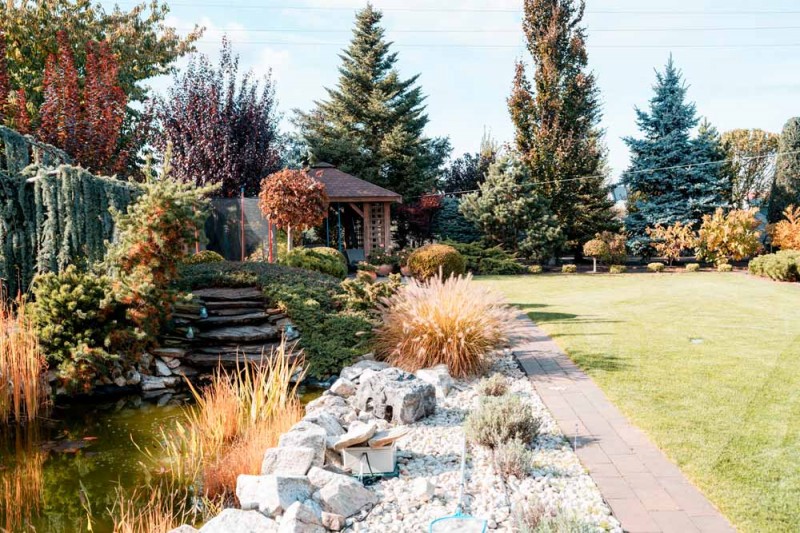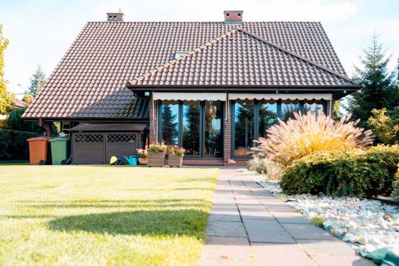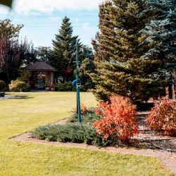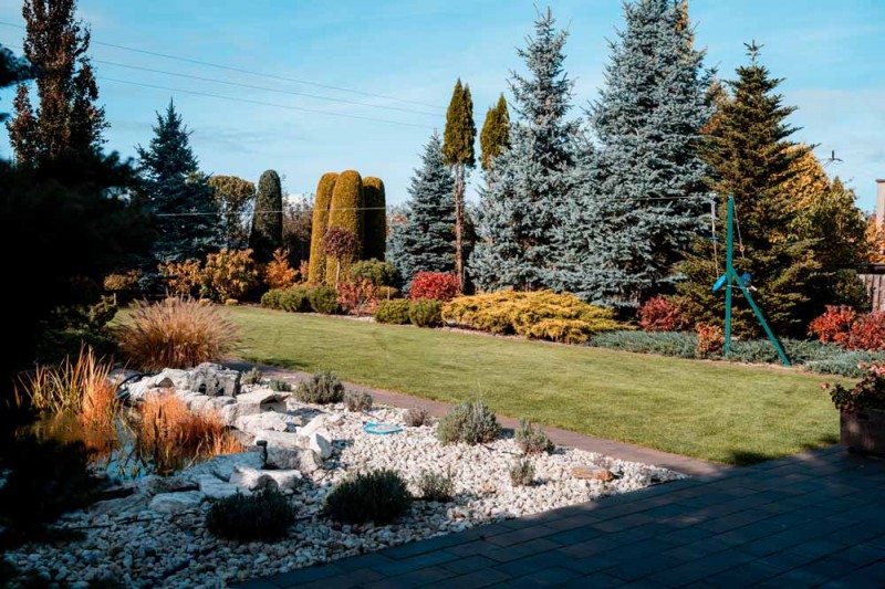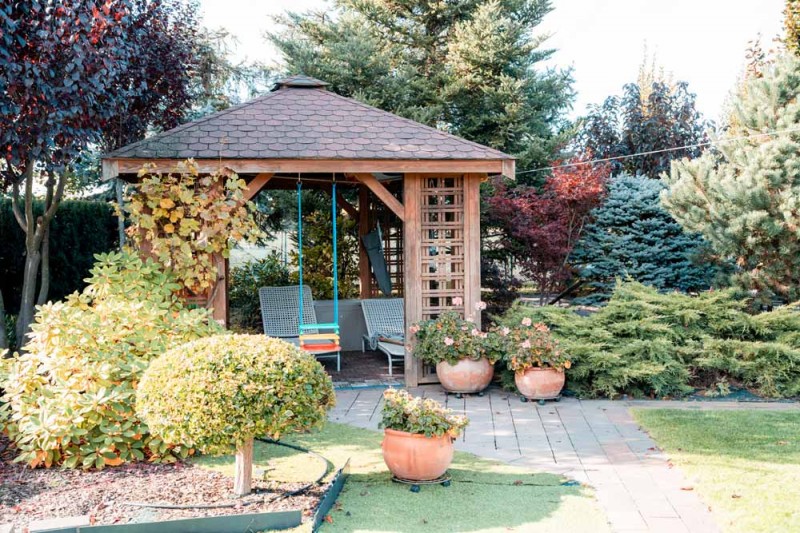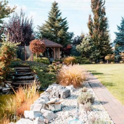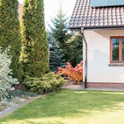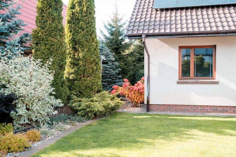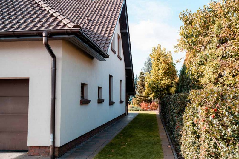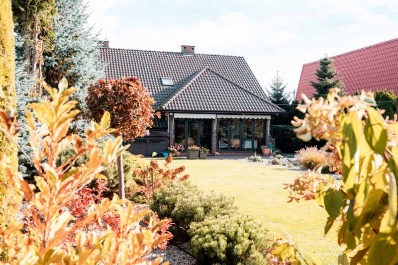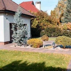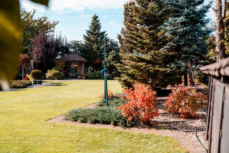 Teren posesji jest ogrodzony i bezpieczny, front działki został ogrodzony płotem metalowym na podmurówce. Brama wjazdowa jest sterowana zdalnie. Wjazd i chodnik utwardzono betonową kostką. Urządzony jest ogród z licznymi nasadzeniami drzew, bylin i krzewów ozdobnych. W tylnej części działki urządzono miejsce służące do wypoczynku i rekreacji, tutaj mamy do dyspozycji zadaszoną altankę grillową, skalniak i oczko wodne. Ogród posiada system automatycznego nawadniania.