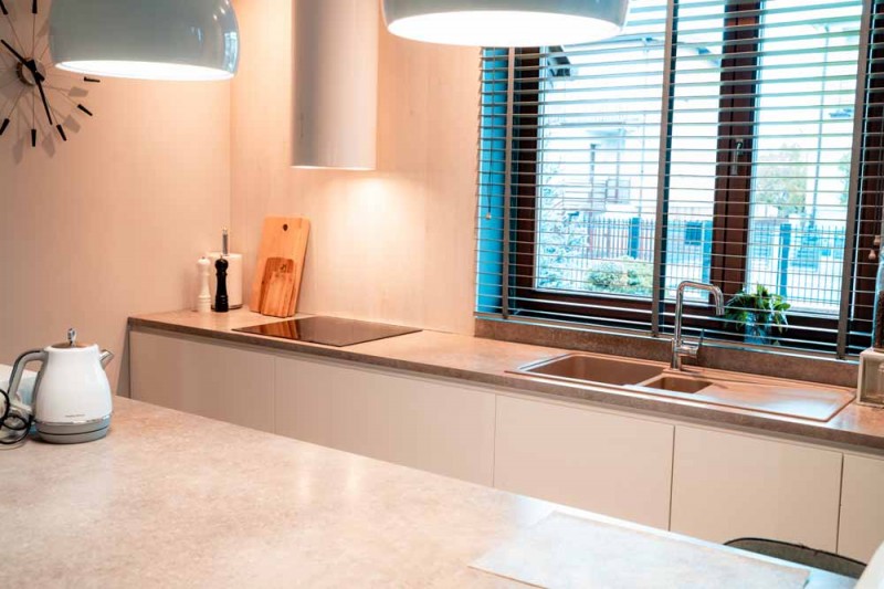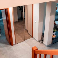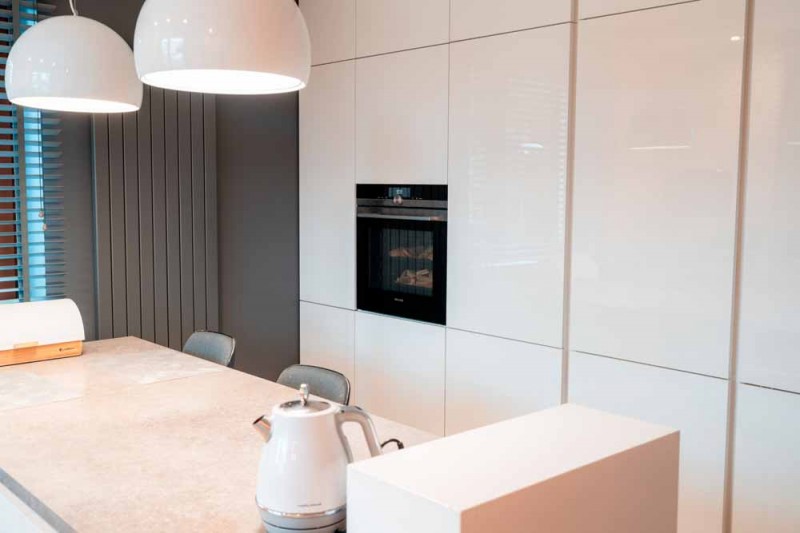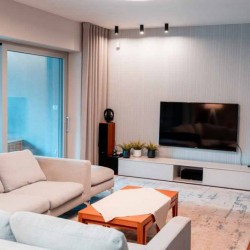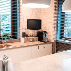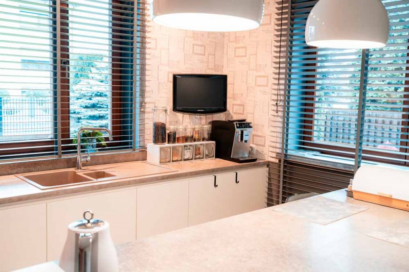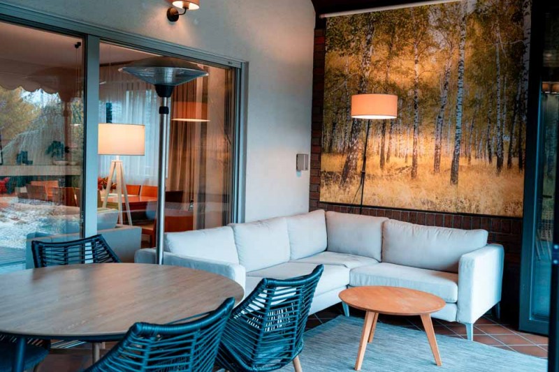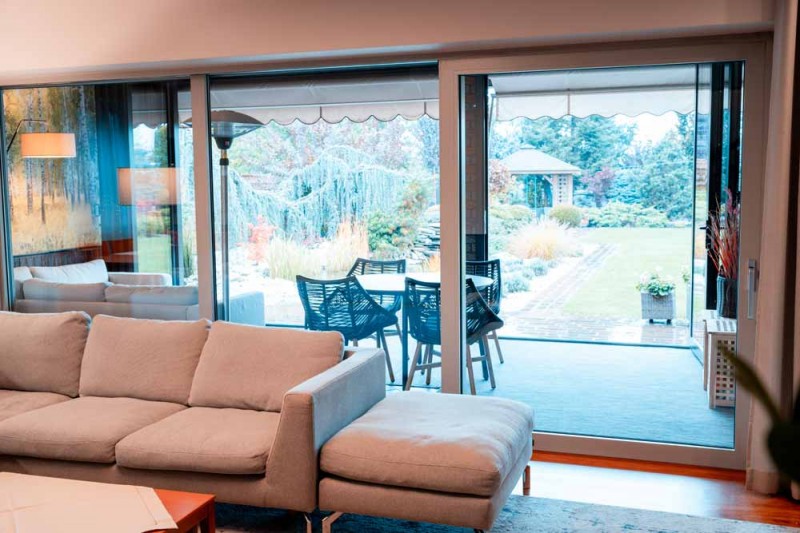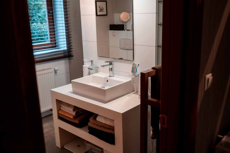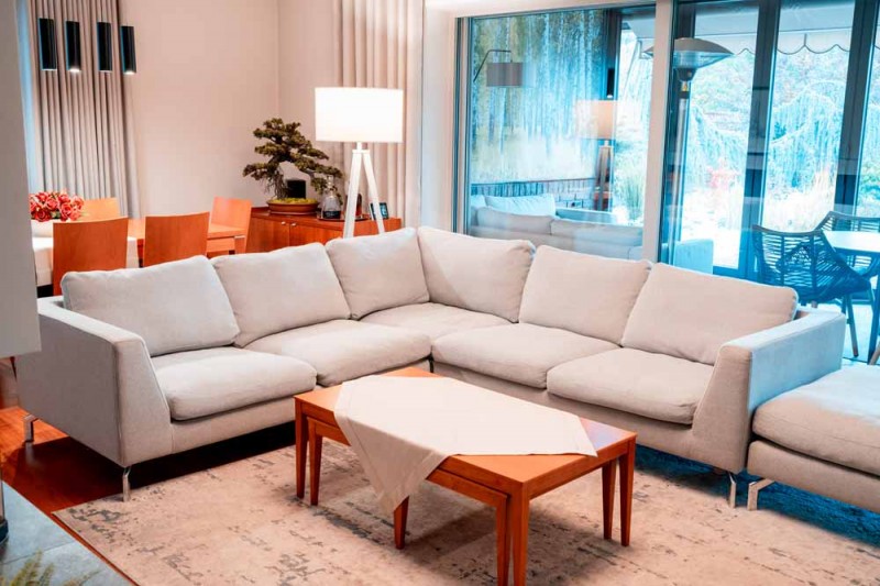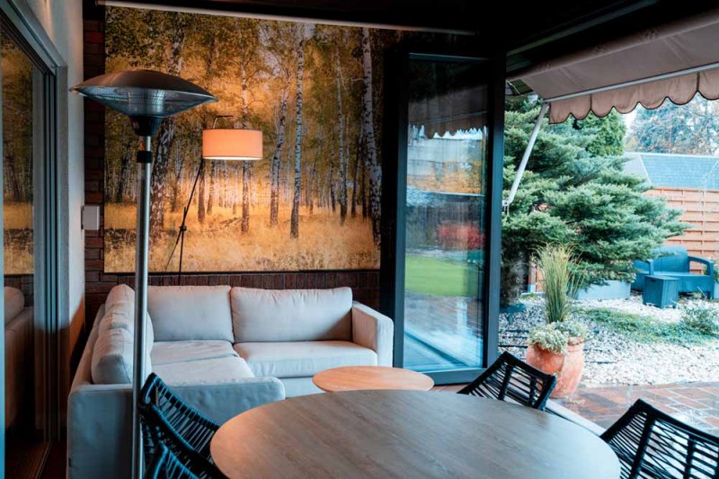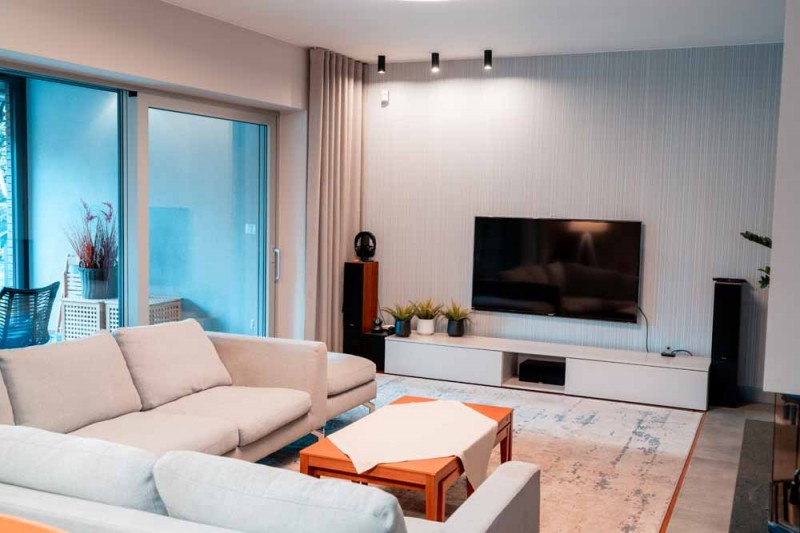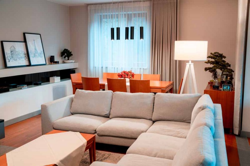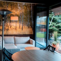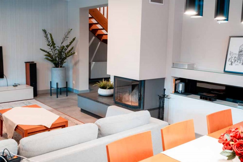 Zamontowane zostały wysokiej klasy okna drewniane zespolone, wykonane z drewna teakowego - brązowe a okno tarasowe z profili aluminiowych jest w systemie HS (przesuwne). Ze względów użytkowych i estetycznych podłogi zostały wyłożone panelami i wielkoformatowymi kaflami ceramicznymi. Doświetlona światłem słonecznym kuchnia jest umeblowana meblami na wymiar, posiada zabudowany sprzęt gospodarstwa domowego. Ściany i podłogi obu łazienek zostały wykończone płytkami ceramicznymi. System profili okiennych ogrodu zimowego posiada możliwość otwarcia tego pomieszczenia w sezonie letnim na ogród. Zamontowany jest system alarmowy i monitoring. Centralne ogrzewanie i wodę ciepłą zasila gazowy kocioł kondensacyjny, grzejniki są stalowe. Sporą korzyść finansową z tytułu zużycia energii elektrycznej daje instalacja paneli fotowoltaicznych o mocy 5,4 kW , która rozliczana w systemie net - meteringu. Panele te znajdują się na dachu budynku. Cena obejmuje zabudowę trwałą – meble kuchenne wraz ze sprzętem agd oraz pojemne szafy garderobiane na wymiar.