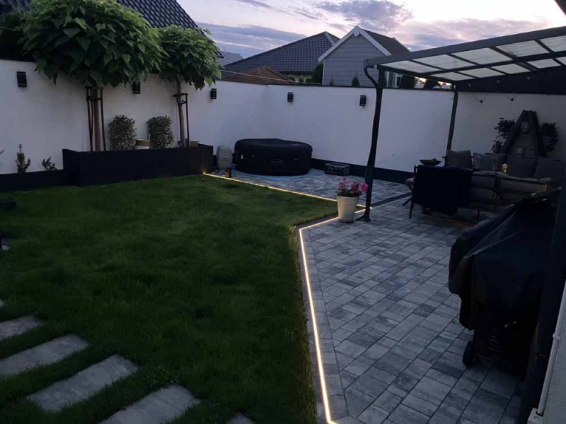 - Taras wykończony kostką i zadaszony – przestronny, z miejscem na narożnik wypoczynkowy, stół jadalniany i przygotowanym przyłączem elektrycznym pod jacuzzi.