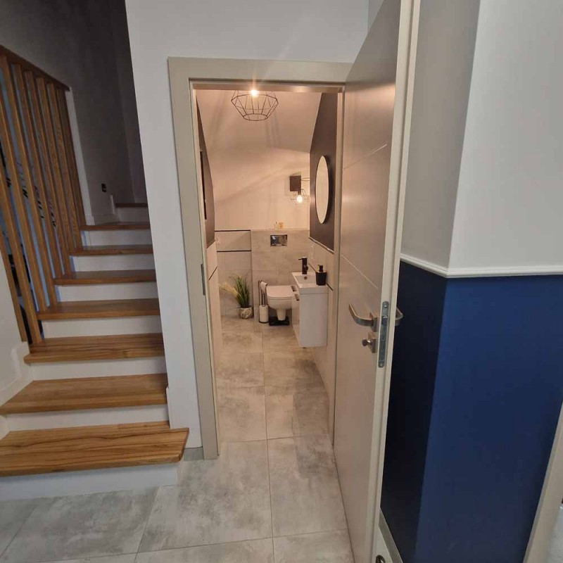 - Łazienka na parterze – elegancko wykończona, idealna dla gości.