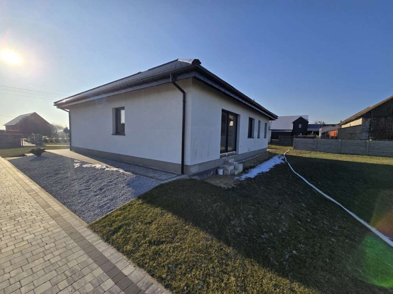 Na parterze mamy do dyspozycji pokój dzienny z aneksem kuchennym, spiżarnię, trzy sypialnie, łazienkę, wiatrołap, pralnię i kotłownię. Drugą kondygnację stanowi wygospodarowane pomieszczenie na poddaszu, którego powierzchnia wynosi 25 m2. Materiały budowlane użyte do budowy są wysokiej jakości a proces budowlany przebiegał ze szczególną starannością o każdy detal.