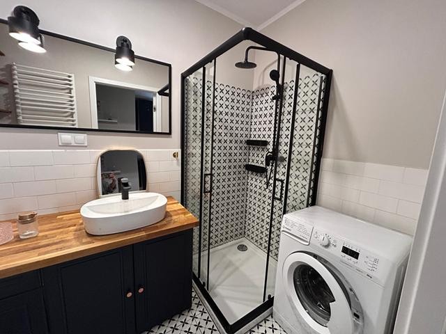 Mieszkanie posiada powierzchnię 52 m2 i składa się z pokoju dziennego połączonego z aneksem kuchennym, 2 sypialni, łazienki z wc oraz przedpokoju. Kuchnię umeblowano meblami na wymiar i wyposażono w płytę indukcyjną, piekarnik, zmywarkę, lodówko-zamrażarkę, pochłaniacz powietrza oraz zlewozmywak. Pokoje w mieszkaniu są częściowo umeblowane. Łazienkę wykończono płytkami ceramicznymi i wyposażono w pralkę, kabinę prysznicową, geberit oraz umywalkę. Do mieszkania przynależy komórka lokatorska.