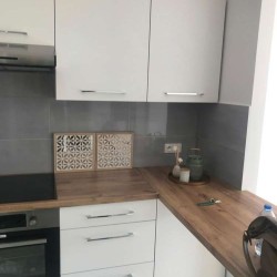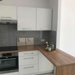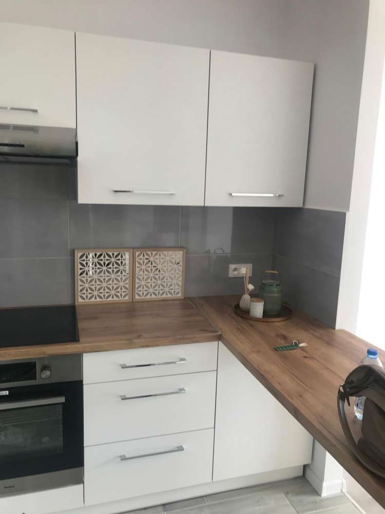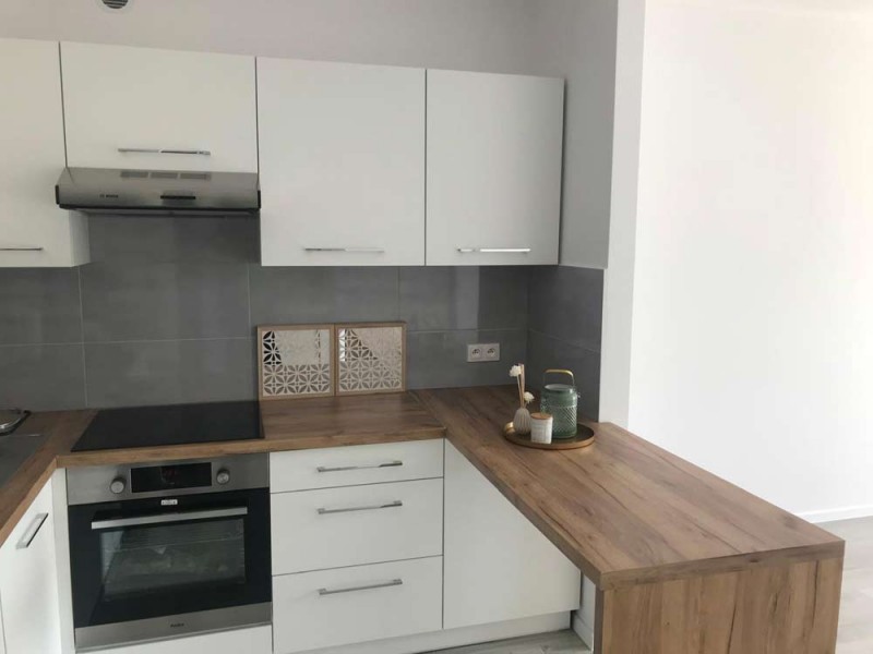 W lokalu zamontowane zostały okna PCV a na podłogach znajdują się kafle ceramiczne i panele. Ściany zostały pokryte gładzią gipsową. Kuchnia jest umeblowana meblami na wymiar, została wyposażona w sprzęt gospodarstwa domowego - płytę indukcyjną, lodówko - zamrażarkę, zmywarkę, piekarnik i pochłaniacz pary. Łazienka wykończona jest w kaflach ceramicznych, posiada kabinę prysznicową, geberit i umywalkę wraz z szafką. Centralne ogrzewanie i wodę ciepłą zasila nowoczesna kotłownia gazowa dostarczająca ciepło do każdego z mieszkań. Cena obejmuje zabudowę trwałą - meble kuchenne wraz z wyposażeniem agd, szafę garderobianą znajdującą się w przedpokoju.