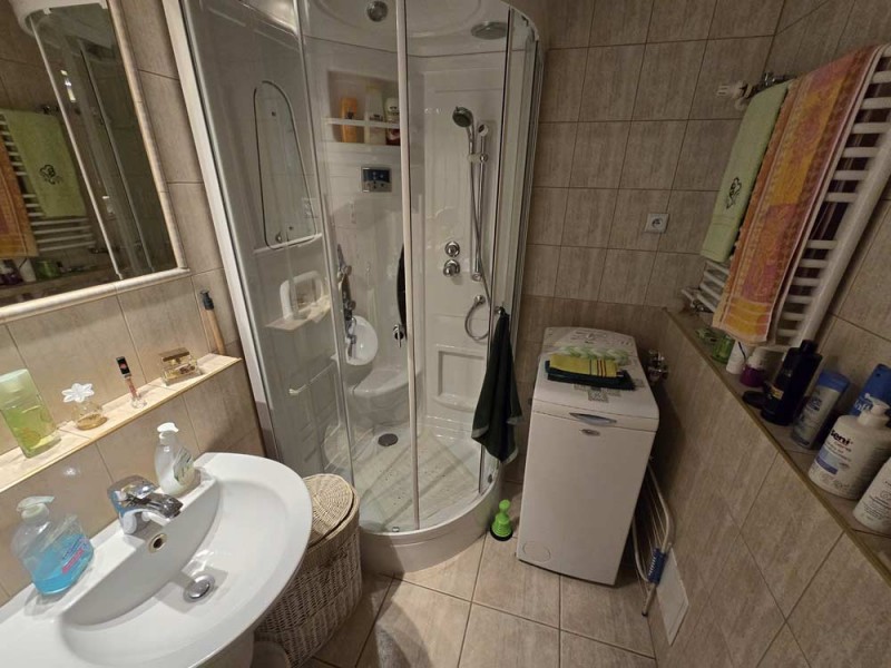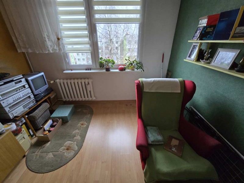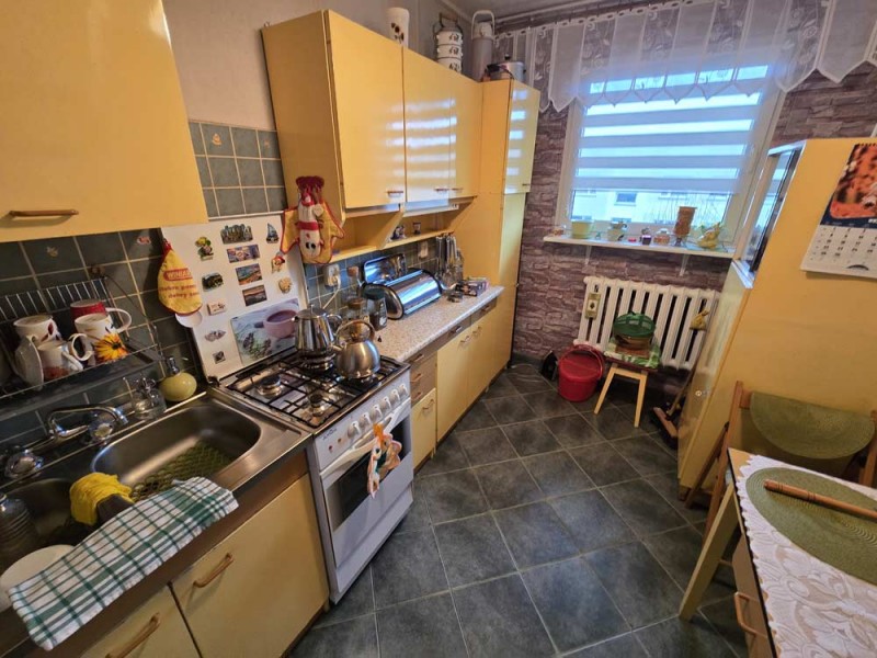 Zamontowane są okna z profili PCV 3 szybowe z roletkami wewnętrznymi a podłogi wyłożone zostały panelami i kaflami ceramicznymi. Wymienione zostały drzwi wejściowe do mieszkania. Duży pokój jest klimatyzowany. Widna kuchnia jest umeblowana, posiada kuchenkę gazową z piekarnikiem elektrycznym. Ściany i podłoga łazienki są wykończone w płytkach ceramicznych, zamontowano w niej kabinę prysznicową. Toaleta jest osobna, wyposażono ją w geberit i umywalkę. Cena obejmuje meble kuchenne, pojemną szafę na wymiar znajdującą się w korytarzu a pozostałe umeblowanie jest w opcji.