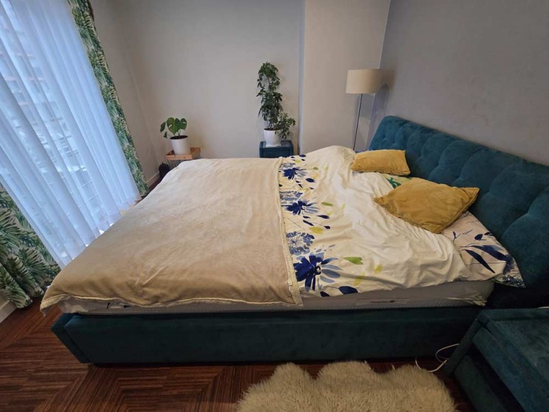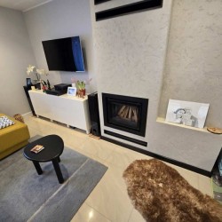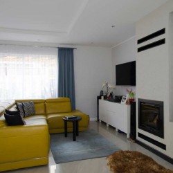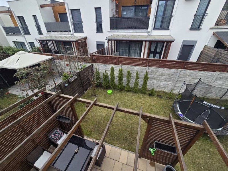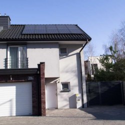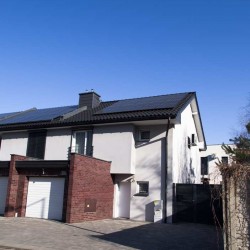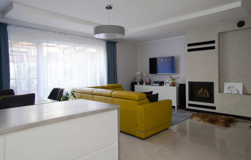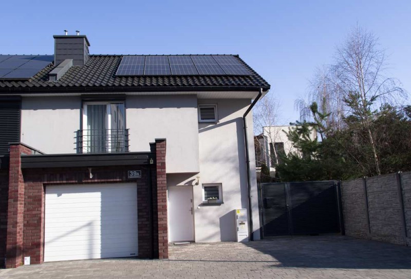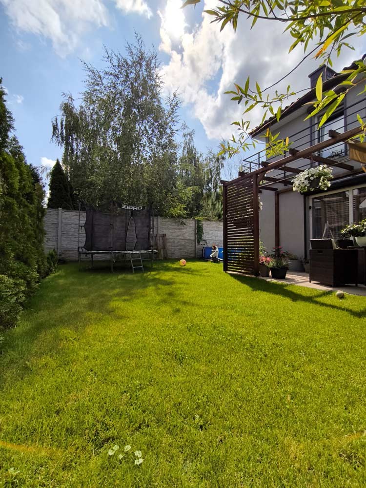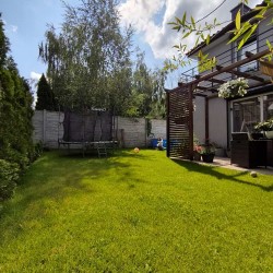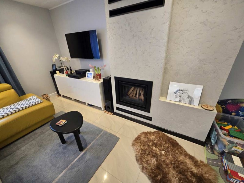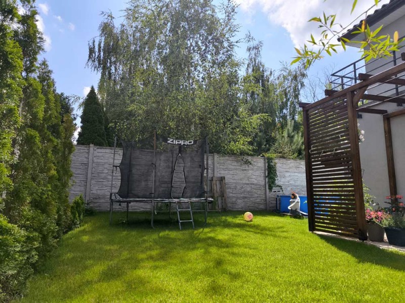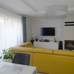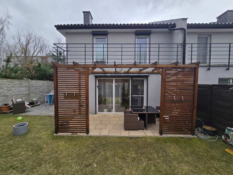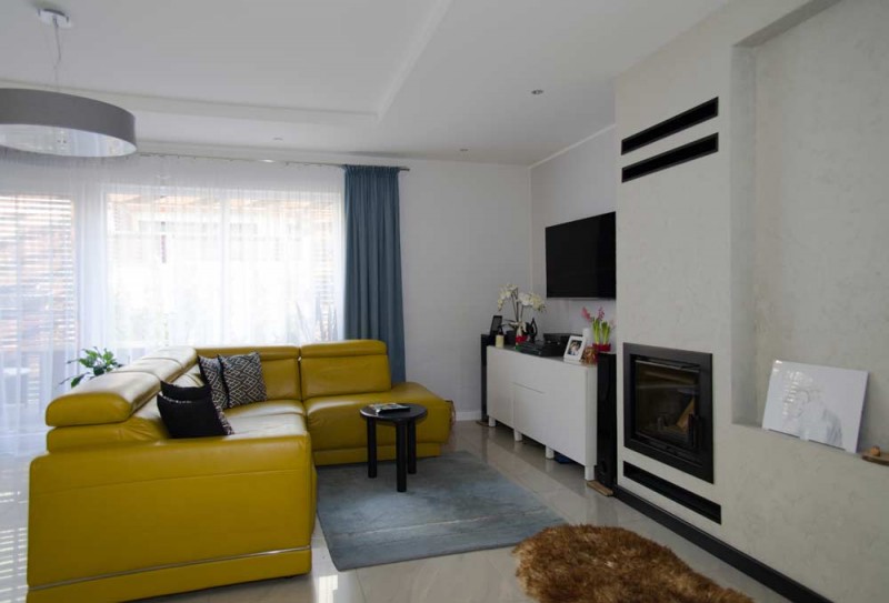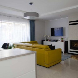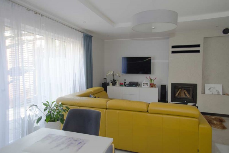 Zamontowane są okna PCV z roletami zewnętrznymi aluminiowymi a na podłogach znajdują się wielkoformatowe kafle ceramiczne i panele. Ściany są gipsowane. W umeblowanej na wymiar kuchni mamy dyspozycji lodówko - zamrażarkę, płytę indukcyjną, piekarnik elektryczny i zmywarkę. Łazienka jest wykończona w płytkach ceramicznych, zamontowano w niej wannę, prysznic z deszczownicą, geberit i umywalkę wraz z szafką. Centralne ogrzewanie i wodę ciepłą zasila nowoczesny kocioł gazowy dwu funkcyjny firmy Junkers, jest to ogrzewanie podłogowe i tradycyjne - z grzejników stalowych. Dużą korzyść finansową z tytułu zużycia energii elektrycznej daje instalacja fotowoltaiczna o mocy 4,50 kW zasilająca klimatyzator z funkcją ogrzewania. Instalacja ta jest rozliczana na starych zasadach. Cena obejmuje umeblowanie i wyposażenie kuchni oraz pojemną szafę garderobianą na wymiar. Pozostałe umeblowanie jest w opcji. Ogródek został zagospodarowany i ogrodzony urządzono na nim trawnik z nasadzeniami krzewów ozdobnych. Taras posiada drewnianą pergolę i w miesiącach letnich może być zadaszony.