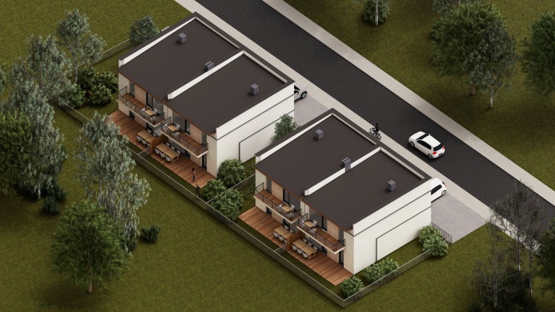 Inwestycja ta polega na wybudowaniu 2 budynków mieszkalnych w zabudowie bliźniaczej składających się łącznie z 8 niezależnych lokali mieszkalnych, które stanowić będą odrębną własność z księgą wieczystą i udziałem w gruncie.