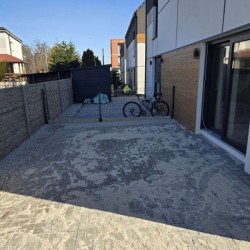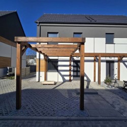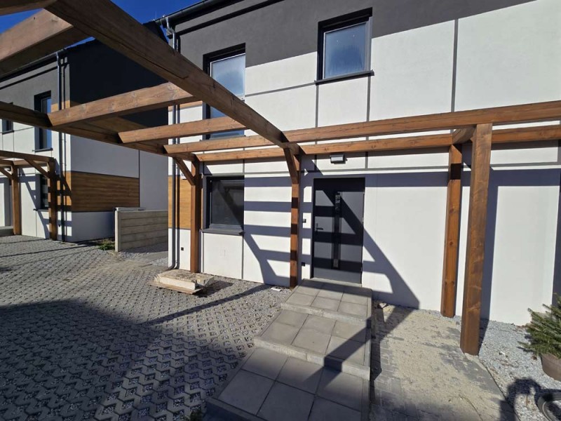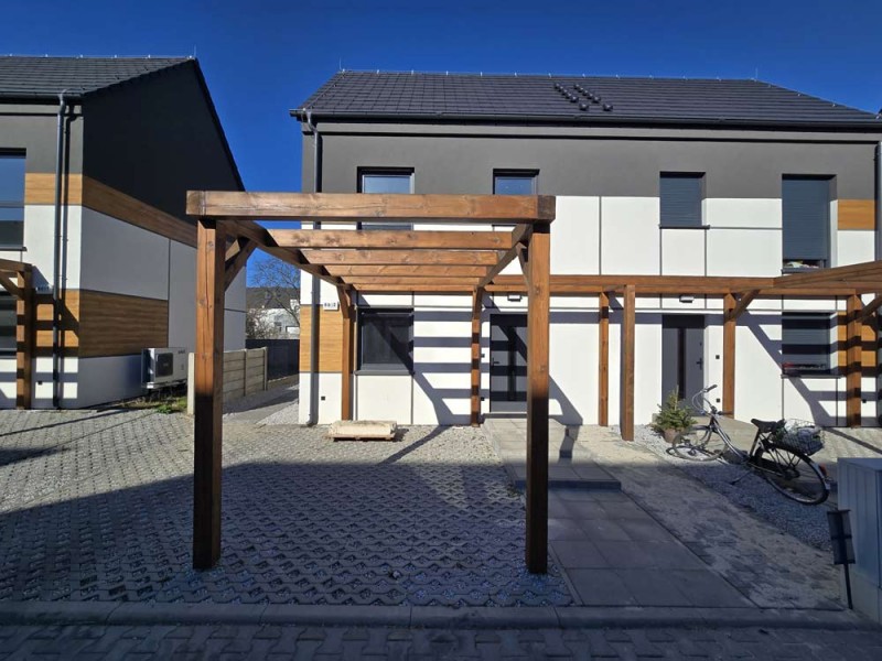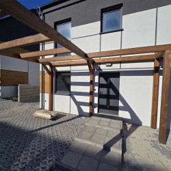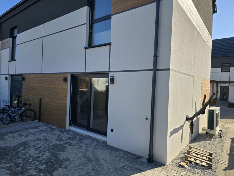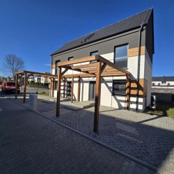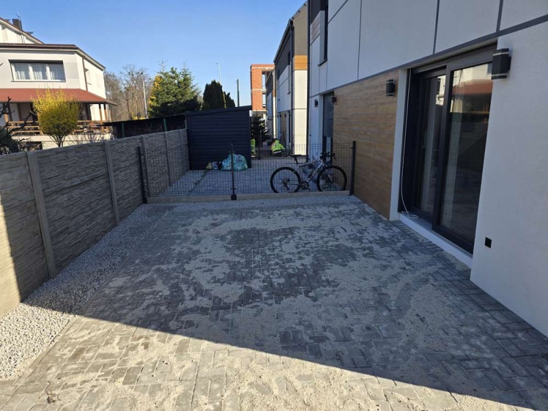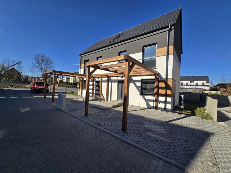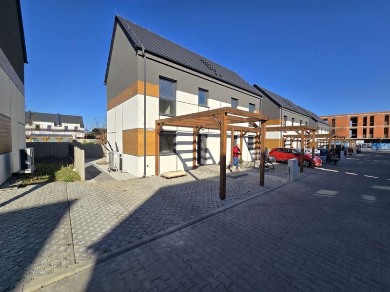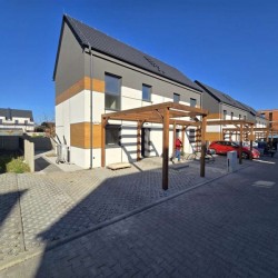 Do domu przynależy ogród (ok. 40 m²) znajdujący się w tylnej części posesji – idealne miejsce na relaks. Przed budynkiem dostępne są dwa miejsca postojowe, w tym jedno zadaszone wiatą. Całe osiedle jest oświetlone i utwardzone kostką brukową, tworząc spójną, estetyczną całość.